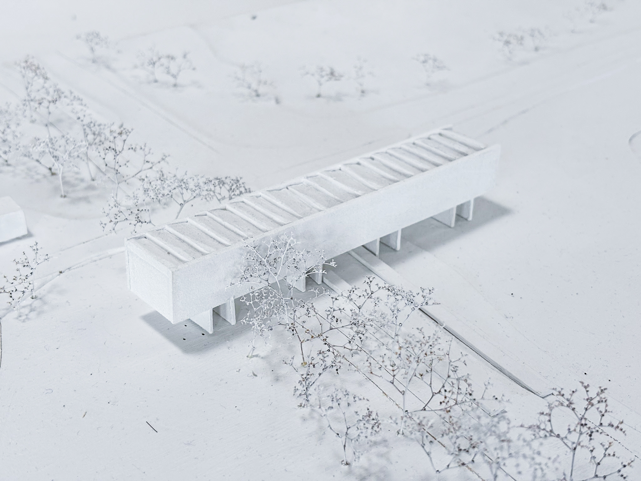 Welche Synergien können aus dem Zusammenführen des Bedarfs einer Bahnstation und einem Archiv für den Kulturraum Hombroich entstehen? Mit einer neuen Haltestelle an diesem Ort entsteht ein repräsentativer Ausgangspunkt für die Besuchenden, auf halber Strecke zwischen Insel und Raketenstation. Das Archiv legt sich als verbindender Riegel über die Gleise. Jeweils zwischen zwei Scheiben finden Auf- und Abgänge, sowie Archiv unabhängige Funktionen ihren Platz. Vorbei am geschlossenen Archiv führt der Weg des Besuchenden hinauf in das offene Archiv. Ein großer mit gedämpftem nordlicht erhellter Raum beinhaltet Kunstwerke, Objekte und Literatur.