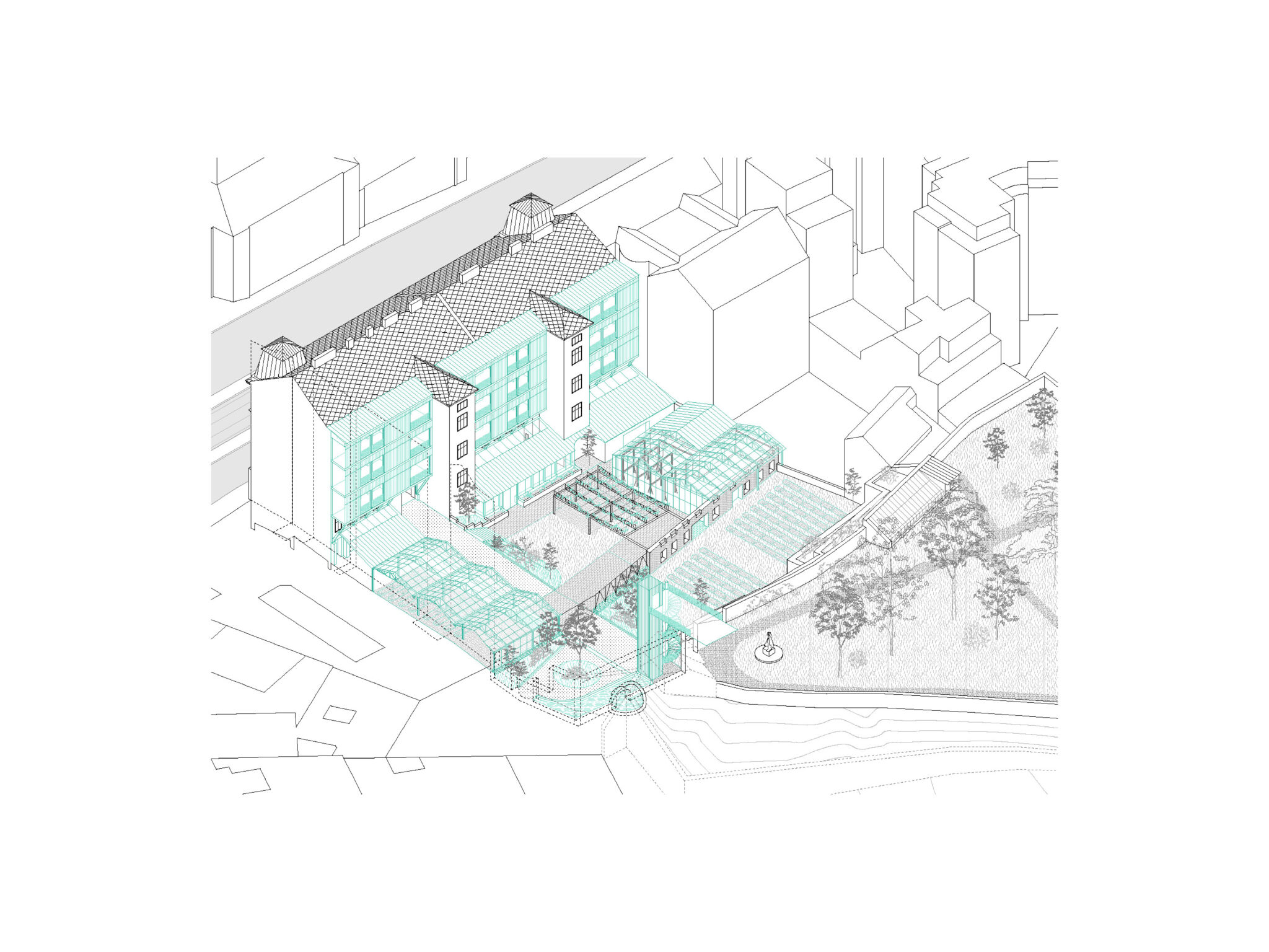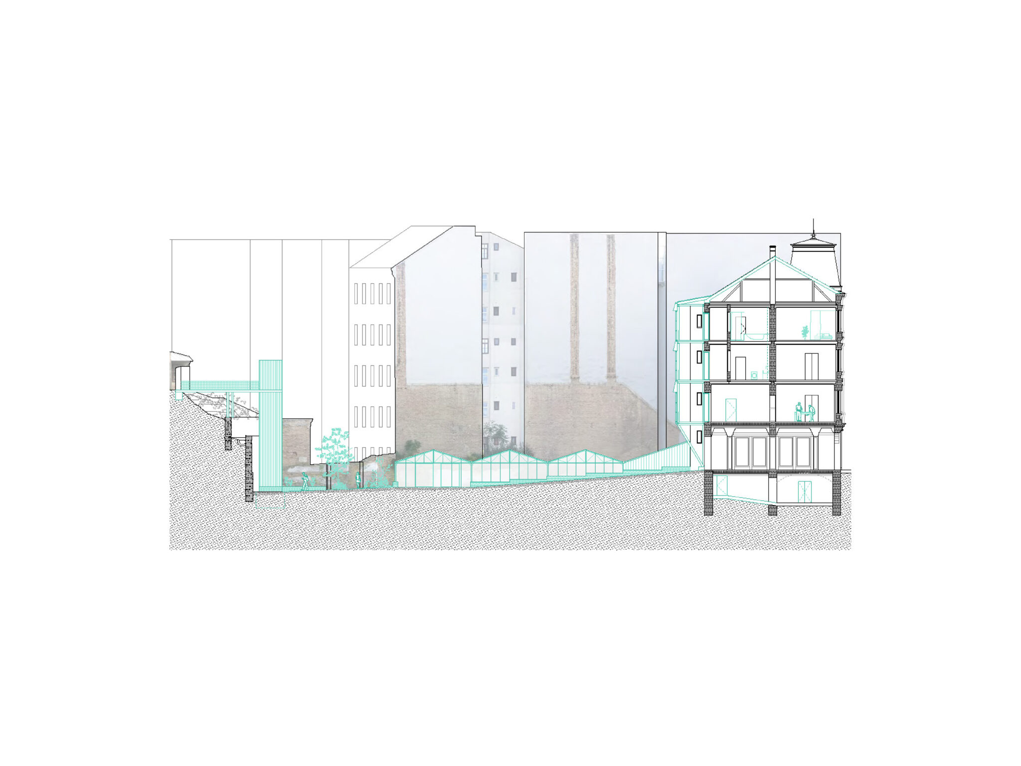 Die Arbeit untersucht die gebaute Geschichte und konstruktive Struktur eines Gründerzeithauses sowie dessen topographisch prägnanten Grundstücks. Während Teile des Gebäudes von Abbruch und Überformung bedroht sind, verfolgt der Entwurf einen minimalinvasiven Umgang mit der vorhandenen Substanz.